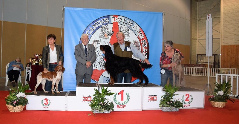 MES GORDON ET LES EXPOSITIONS Amscot Cheyenne Poacher (extrême gauche) remporte le CAC-CACIB à Liège Butch Cassidy, Meilleur Puppy dans le ring d'honneur, Liège (07/2014) Sundance, Meilleur Jeune, Liège (07/2014) avec Charlotte Godart. Cheyenne (à gauche), CAC-CACIB, Crufts Qualific. Luxembourg (08/2014) Sundance, Mailleur Jeune à Charleroi avec Charlotte Godart (10/2014). Butch Cassidy, Meilleur Jeune, Crufts Qualificat., Bruxelles (12/2014) Cheyenne (au fond), CAC-CACIB, BOS, Mouscron (01/2015) Butch Cassidy, Meilleur Jeune, Hoogstraaten (02/2015) Celtic Blackpearl Kochanej Emilki - Meilleure Jeune (Pologne, 01/2015) Butch Cassidy, RCAC, Wieze (05/2015) avec Charlotte Godard. Butch Cassidy, CAC, BOS, BOB, Lommel (06/2015). Blackpearl, 1ère Excellent, Classe intermédiaire, Lommel (06/2015). Blackpearl sur mes genoux, Lommel (06/2015). Butch Cassidy, Meilleur de Race, Lommel (06/2015). Sundance, 2 ans, présenté par Charlotte Godard. Butch Cassidy, RCAC-RCACIB, et Pearl, RCAC-RCACIB, Liège (07/2015). Butch Cassidy (à droite), RCAC, Belgian Gordon Setter Club (08/2015). Cheyenne, 2e Exc COM, Belgian Gordon Setter Club, Anvers (08/2015). Cheyenne, CAC-CACIB, BOB et Pearl, CAC-CACIB, BOS, Malines (08/2015). Pearl dans sa cage après les CAC-CACIB, BOS, Malines (08/2015). Butch Cassidy, CAC, Libramont (09/2015). Amscot Cheyenne Poacher (à gauche) CAC-CACIB, BOB, Compiègne (09/2015) Butch Cassidy (à gauche), CAC-CACIB, BOB, Charleroi (10/2015). Butch Cassidy, BOB, Charleroi (Octobre 2015). Sundance (à gauche), 1er Excellent en COM, Courtrai (Novembre 2015). BlackPearl, 1er Exc. CIF, RCAC-RCACIB, Courtrai (Novembre 2015). Black Mystery Quite the Sundance Kid, 1er Exc. COM, Gand (02/2016). Sundance, à gauche, en lice pour le CACIB, Gand (02/2016). Sundance joue les mannequins à l'exposition de Gand (02/2016). Cheyenne, RCACL-RCACIB, et Butch, CACL, Luxembourg (03/2016). Celtic BlackPearl Kochanej Emilki (à droite) CAC, BOS, Genk (04/2016). Sundance, 2e Exc "A" sur 17 inscrits en COM, NE de la RASG, 05/2016. Butch Cassidy, CACS, BOS, NE de la RASG (F), 05/2016. Butch Cassidy, CACS, BOB, Douai (F), 06/2016. Butch Cassidy, RCACS-RCACIB, Douai (F), 06/2016. Butch Cassidy (à gauche), CAC-CACIB, BOB, Liège, 07/2016. Butch Cassidy, 4e EXC CTM, EDS Bruxelles, 08/2016 Butch, Best Working Dog in Show, Belgian Gordon Setter Club, 08/2016 Sundance, 3e EXC COM, Belgian Gordon Setter Club, 08/2016 Butch, RCACS-RCACIB, et Sundance, CACS-CACIB, BOB, Dijon (F), 09/2016 Black Mystery Quite the Sundance Kid, CACL-RCACIB, Luxembourg, 09/2016 Black Mystery Quite the Sundance Kid, RCACS, Le Touquet (F), 09/2016. Black Mystery Quite the Sundance Kid, CACS-RCACIB, Villepinte, 10/2016 Butch Cassidy, CACIB, BOB, BOG, Villepinte Paris Nord (F), 10/2016. Black Mystery Quite the Sundance Kid, CAC-CACIB BOB, Mouscron, 01/2017 Sundance, Best Working Dog in Show, Mouscron, 01/2017 Sundance, Best Working Dog in Show, Troyes (F), 02/2017. Black Mystery Quite the Sundance Kid, CACL, Luxembourg, 04/2017. Black Mystery Quite the Sundance Kid, RCACS, Amiens (F), 05/2017. Butch, 1er Exc CTM, Anw.Dt.Ch.VDH, RCAC, Clubsieger Asslar (A) 05/2017 Amscot Cheyenne Poacher 2e EXC CCHM, Clubsieger Asslar (A), 05/2017. Amscot Cheyenne Poacher 2e EXC CCHM, Clubsieger Asslar (A), 05/2017. Sundance, CAC-CACIB, BOB, Genk, 06/2017. Présenté par ML Materne. Butch Best Working Dog in Show 2017, Club Setter & Pointer Viersen (A) Black Mystery Quite the Sundance Kid, CACS BOS Le Touquet (F), 09/2017 Sundance CACIB, BOB, BOG3, Compiègne (F), 09/2017. Sundance, CACS, BOB, BOG4, Paris Nord Villepinte (F), 09/2017. Black Mystery Quite the Sundance Kid, CACS, BOB, Paris (F), 01/2018. Sundance, CACS, BOB, BOG2, Flixecourt (F), 03/2018. Butch, VDH, RCACIB, Offenburg (A), 03/2018. Amscot Cheyenne Poacher, Rés.VDH, Wegberg (A), 03/2018. Amscot Cheyenne Poacher, CACL, Luxembourg, 04/2018. Sundance, CACS, BOB, BOG3, Maubeuge (F), 04/2018. Sundance, CAC-CACIB, BOB, Brabo Winner, Anvers (B), 04/2018. Butch, Meilleur sujet de la Nationale d'Elevage 2018, RASG (F). Butch, RCACIB, Douai (F), 10/2018. Présentation Martine Buyck. Sundance, CAC-CACIB, BOB, BOG2, La Louvière (B), 10/2018. Amscot Cheyenne Poacher (à gauche) CACIB, BOB, Douai (F), 02/2019. Cheyenne (BOB) et sa fille Legend (CACS-RCACIB), Douai (F), 02/2019. Sundance, CACS,CACIB,BOB, Championnat de France 2019, Paris, 06/2019. Butch Best Working Dog in Show à la Nationale en Hollande, 07/2019. Sundance, CAC,CACIB,BOB, Rotterdam (NL), 08/2019, homologue son CIE.
